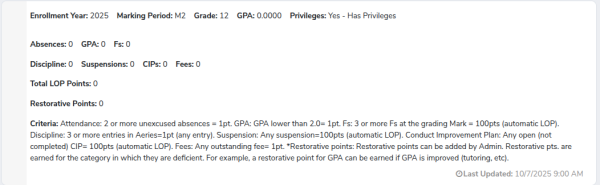 - Positive behavior (staying out of trouble, with no more than three disciplinary instances recorded in the Aeries system).