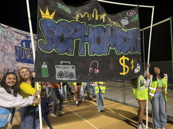 The halftime show started off with each class, freshmen, sophomores, juniors, and seniors, walking along the football field with Greek Week banners.
